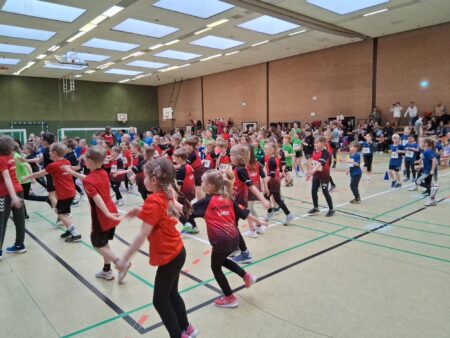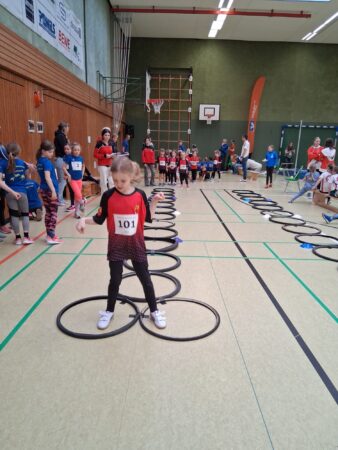 Nach einem gemeinsamen Aufwärmprogramm, angeleitet von zwei jungen Athletinnen der LG Peiner Land, starteten kurz nach 10:00 Uhr die Wettkämpfe. An den fünf Stationen – 25 m Hindernissprint, Hoch-Weitsprung, Medizinballstoß, Drehwurf und Wechselsprünge – sammelten die Teams fleißig Punkte. Den sportlichen Abschluss bildete der „Zwergenparcours“, bei dem noch einmal alle Kinder gefordert waren.